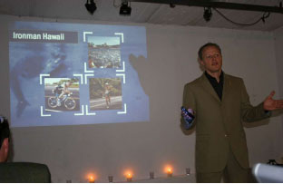 Zum Höhepunkt der Veranstaltung kam es dann, als der 3-facher Age-World-Champion von Hawaii und Sportler des Jahres 2000 der World Triathlon Corporation Kai Röckert mit seinem Vortrag „Ziele sind erreichbar" die Teilnehmer in seinen Bann zog. Die Erzählungen des Ironman sowie die Bilder und Kurzfilme mit Impressionen aus Wettkäpfem auf Hawaii waren für alle Teilnehmer sehr interessant und haben hoffentlich bei einigen bleibenden Motivationsschübe ausgelöst.