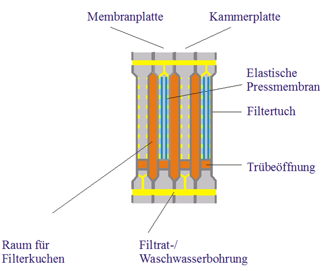 Die Filterpressen sind Druckfilter und bestehen aus einem festen Kopfstück und einem beweglichen Druckstück. Zwischen beiden Teilen befinden sich Kammer- und Membranfilterplatten. Beim Zusammenschieben der Filterplatten bilden sich Kammern, die während des Filtrationsvorganges mit Schlamm gefüllt werden. Nach dem Filtrieren wird der entwässerte Schlamm weiter komprimiert. Bei der Membranfilterpresse handelt es sich um eine Bauart, die vom Grundaufbau einer Kammerfilterpresse entspricht. In der Presse sind wechselweise Kammerplatten und Membranträger eingebaut. Um eine optimale Filterwirkung zu gewährleisten, müssen die Membranfilterpressen nach einer bestimmten Anzahl von Chargen einer Grundreinigung unterzogen werden.